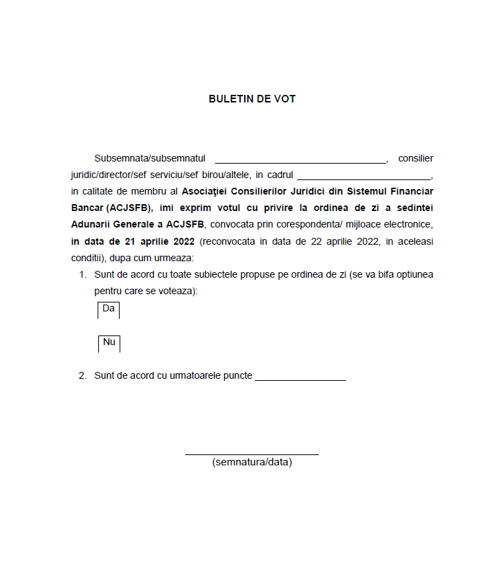 ASOCIAȚIA CONSILIERILOR JURIDICI DIN SISTEMUL FINANCIAR-BANCAR In conformitate cu prevederile art. 19 (1) din Statutul Asociatiei Consilierilor Juridici din Sistemul Financiar Bancar (“ACJSFB”), Consiliul Director (CD) convoaca Adunarea Generala Ordinara a Asociatilor (AGOA) in data de 21 aprilie 2022, cu urmatoarea ordine de zi: Aprobarea Bilantului Anual al ACJSFB aferent exercitiului financiar incheiat la 31.12.2021,…