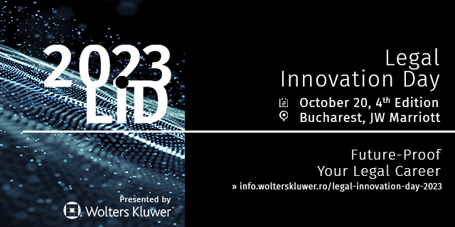 Wolters Kluwer România și Asociația Consilierilor Juridici din Sistemul Financiar-Bancar anunță organizarea celei de-a IV-a ediții a Legal Innovation Day. Cea de-a patra ediție a conferinței internaționale Legal Innovation Day, organizată de Wolters Kluwer România, va fi susținută în format hibrid, Vineri, 20 Octombrie 2023, începând cu ora 09:30, la Hotelul JW Marriott, București. Încă…